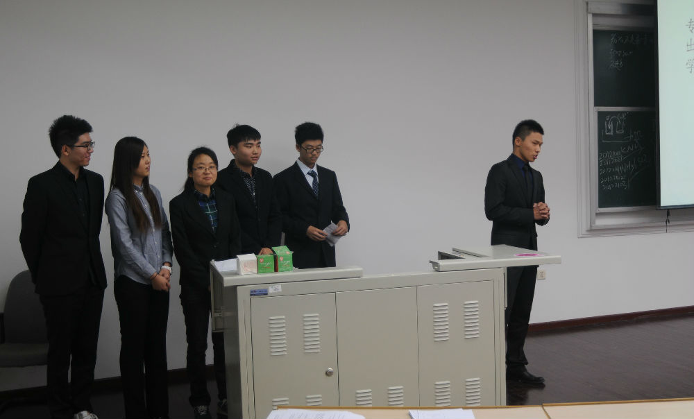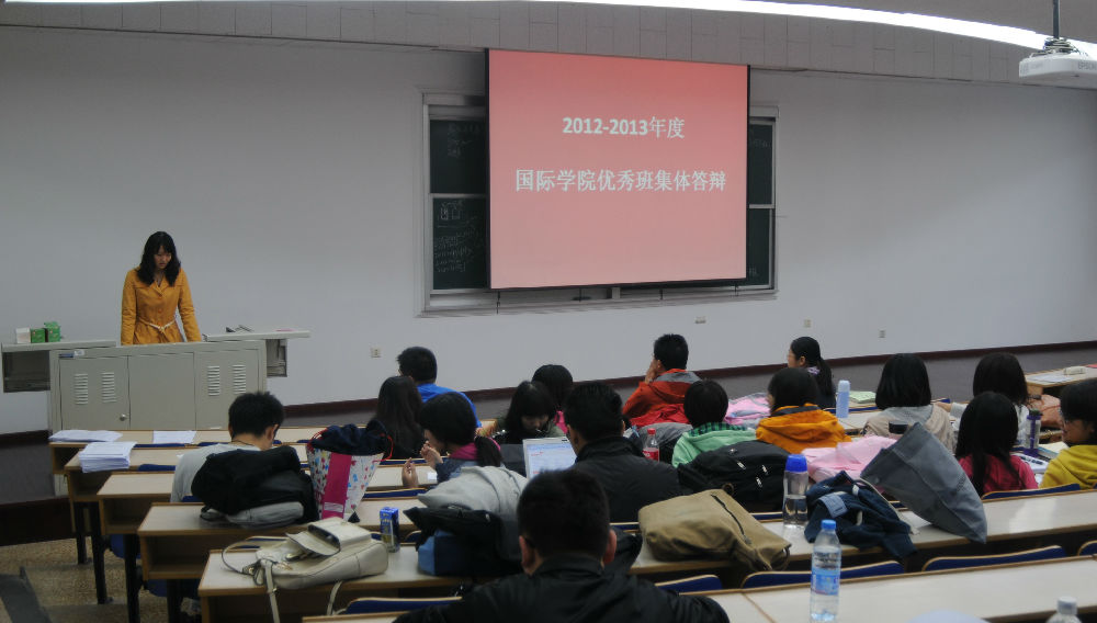In October 15th,2013.In the afternoon,the excellent class of international college in 2012~2013 make open reply at lecture theater no.1. Five class attended this reply. Every class committee number were suppose show them PPT and reply for two minutes. Teacher Liu and Guo also attended to this activity as judges.