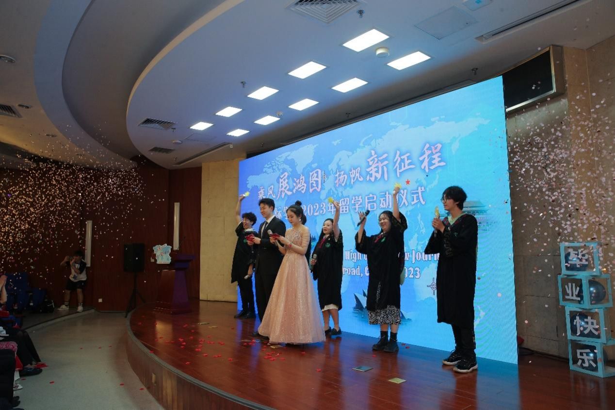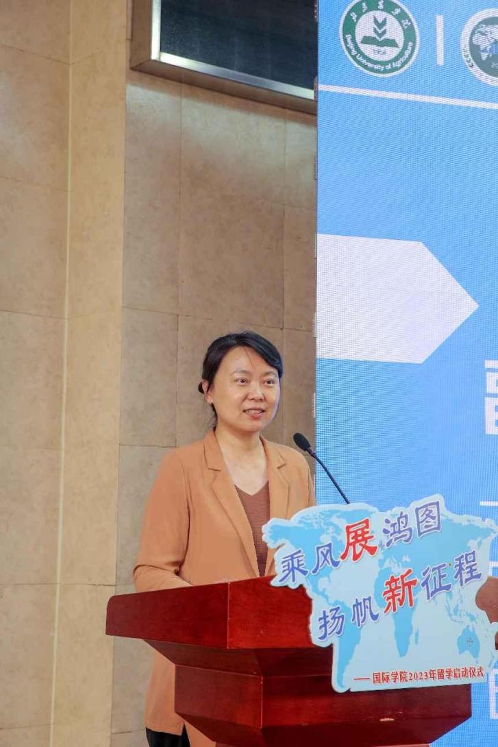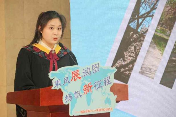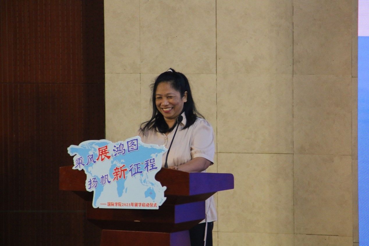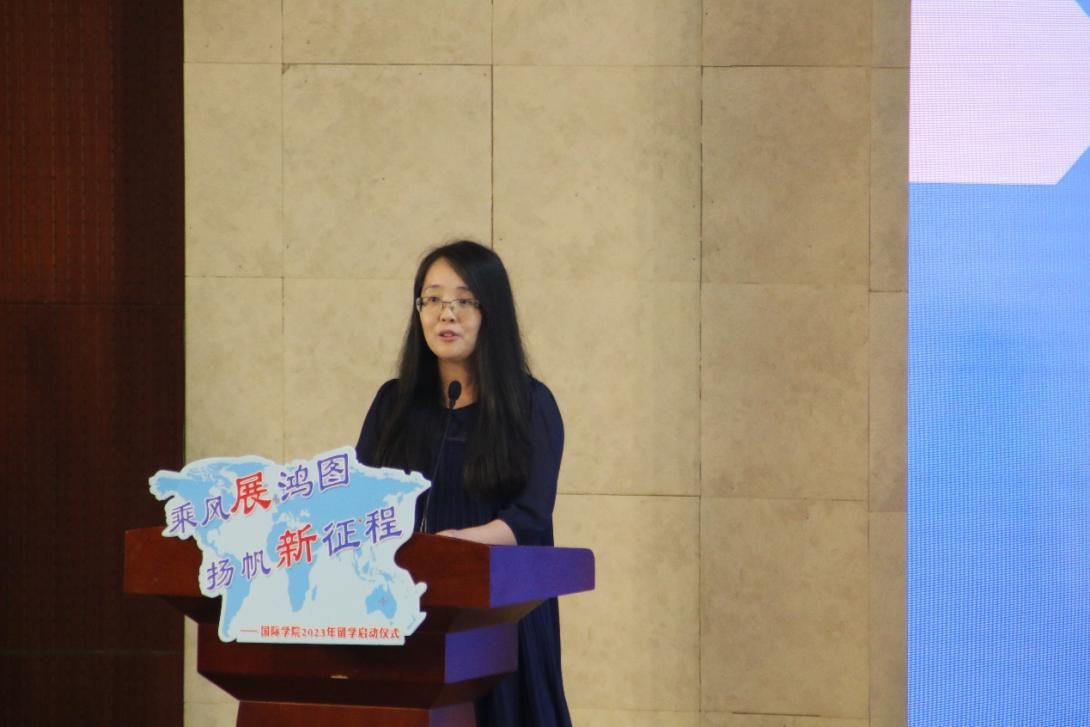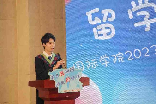 在教师代表寄语中,国际经济与贸易系系主任吕瑞和外教Hilda女士向完成前三年国内学习即将开启留学征程的同学们表示了热烈的祝贺,并深情嘱托了在国外留学时的注意事项。她们鼓励同学们面对国外全新的职工活,要迎难而上,砥砺前行,坚持不懈,以新时代青年积极向上、踔厉奋发的姿态,为实现中华民族的伟大复兴贡献青春力量。
